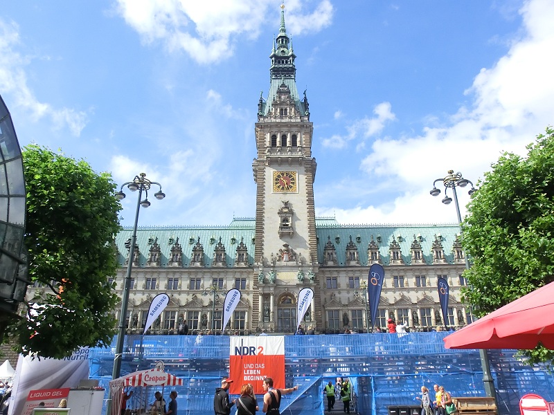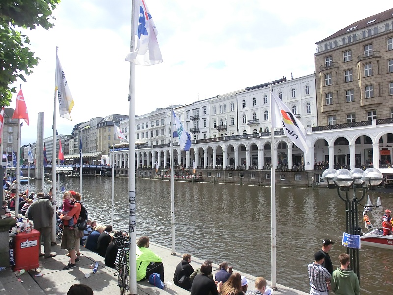 Nous arrivons à la station « Jungferstieg » et regagnons la place de la mairie. Quelle bonne idée d’avoir laissé les Panhard à l’hôtel ! Il y a foule dans Hambourg et tout le centre-ville est bouclé… Des nageurs qui s’affairent dans la « Binnenalster », des cyclistes et des coureurs et beaucoup, beaucoup de spectateurs ! C’est le triathlon de la ville !!!