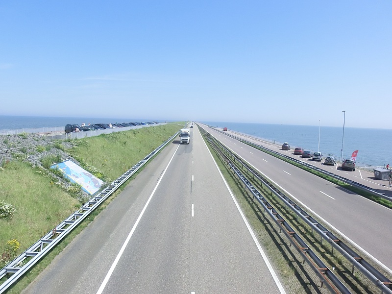 Puis nous entrons sur l’Afsluidijk, une digue en pleine mer longue d’une trentaine de kilomètres… Mais ce n’est pas impressionnant du tout car la digue est plus haute que la route sur notre droite et la route fort large, à double-voie !