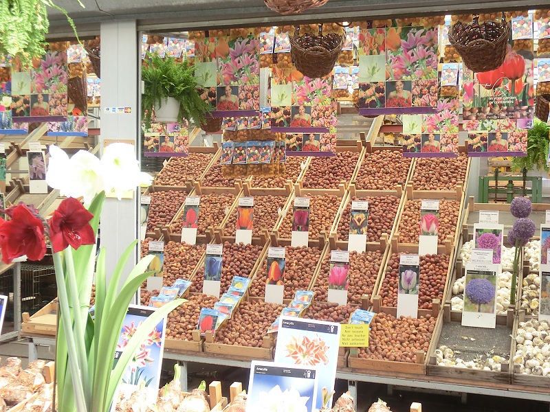 Au marché, pas de fleurs fraîches coupées : question de saison ? Mais beaucoup de bulbes, de tulipes surtout mais pas uniquement ! On ne cultive d’ailleurs pas que les fleurs à Amsterdam…