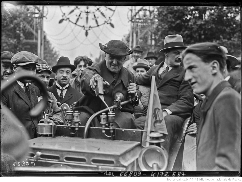 Juin 1921, Paris Champs Elysées, l'abbé Gavois (à gauche) conduit sa Panhard & Levassor type P2C. Cette voiture, était et est toujours la plus ancienne automobile à pétrole construite en série au monde.
