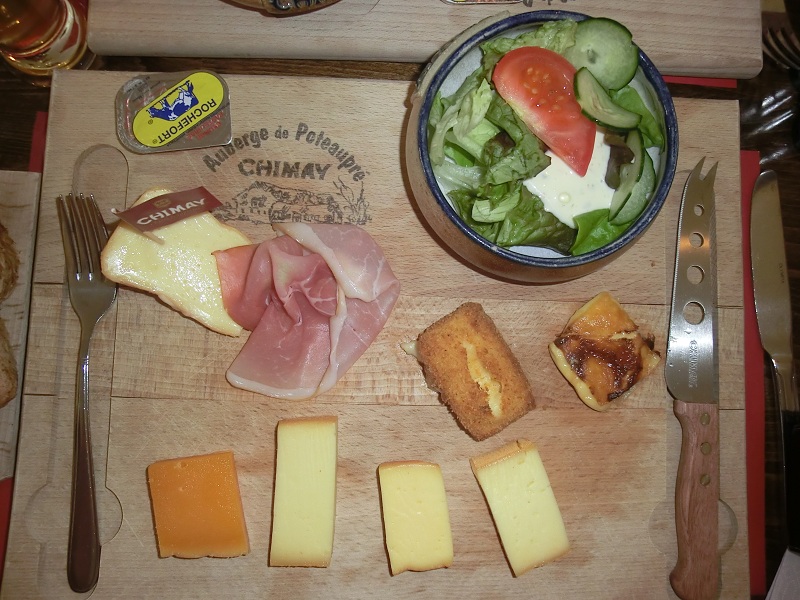A 12 heures 45 nous prenons la décision de déjeuner à côté à l’Auberge du Poteaupré : planche dégustation de fromages, accompagnée d’une bière de Chimay, puis un dessert : quelques-uns tenteront le sabayon glacé à la bière bleue de Chimay, pas mal !