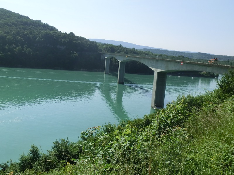 Premier arrêt au Pont de la Pyle pour admirer le lac et le pont... et attendre Dédé qui arrive bon dernier à bride abattue !