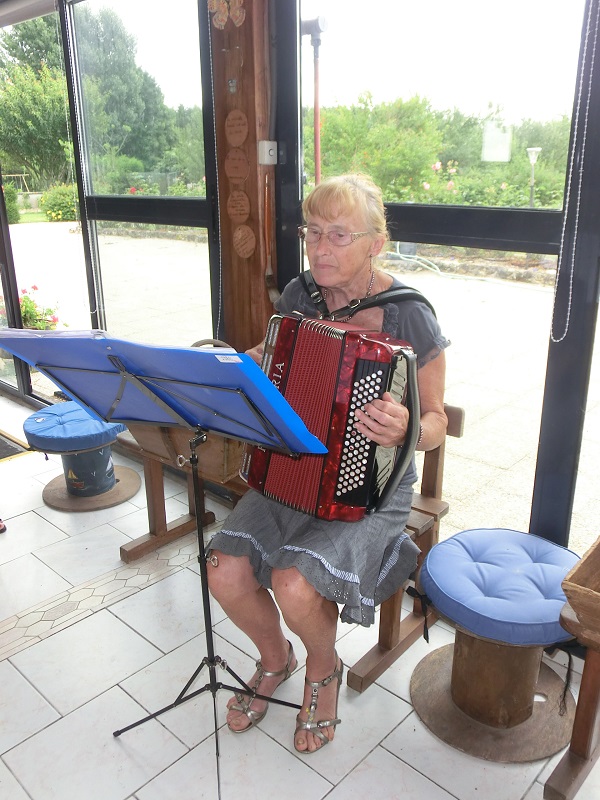 Yvette, qui nous a fait du "broyé du Poitou" pour accompagner le café, nous joue un petit air d'accordéon, sa nouvelle passion.