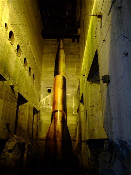 Une maquette à l'échelle 1 d'un V2. Les fusées V2 assemblées devaient sortir du bunker par ce passage (qui a été muré après le bombardement)