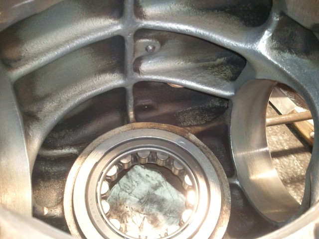 Maintenant, tu vas tout observer avec une grande attention nous voyons déjà que le roulement du palier avant possède encore ses matages d'origine,on dirait même que l'on voit le signe - sur la droite (??) observe bien les galets qui ne doivent pas être marqués. Si les galets sont nets, ne démonte pas ce roulement qui a fait ses preuves... regarde quand même, comment le vilebrequin entre dedans et s'il n'est pas bruyant.