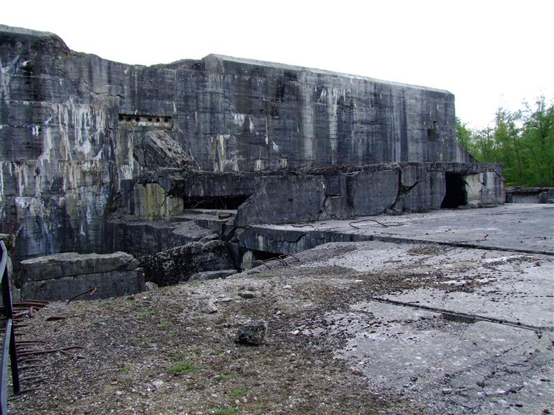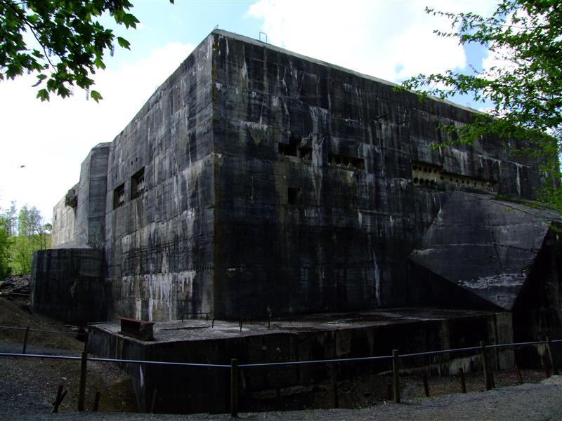 Le blockhaus ne fut jamais achevé du fait des bombardements répétés des Britanniques et des Américains dans le cadre de l'opération Crossbow. Les attaques causèrent des dégâts importants et l'empêchèrent d'être utilisé dans son rôle initial ; une partie du bâtiment fut transformée en usine de production d'oxygène liquide. Sur la photo précédente (coté sud) et sur la suivante (côté nord), on peut voir les dégâts provoqués par ces bombardements. 33 mètres de haut, 95 de large, des murs épais de plusieurs mètres et pourtant les bombes de 6 tonnes n'ont pas percé le bunker. Si le côté nord est le plus endommagé c'est parce que le béton était encore frais. Les dégâts les plus importants ont été causés par les bombes sismiques qui sont tombés à proximité immédiate de l'ouvrage (on peut encore voir un cratère de plus de 30 mètres de diamètre), ces ondes de choc ont ébranlé les fondations.