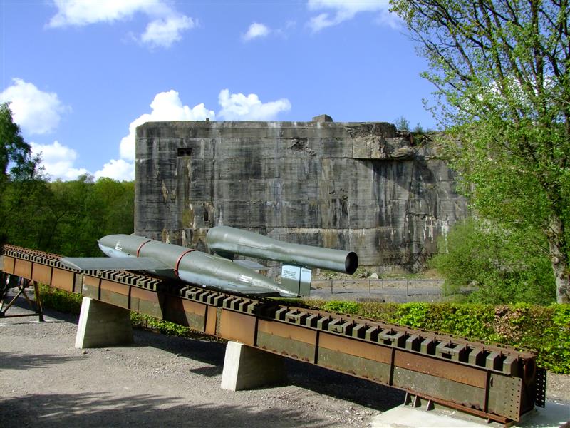 Devant le blockhaus une rampe mobile de lancement de missile V1. Aucun V2 n'a jamais été lancé depuis ce site.