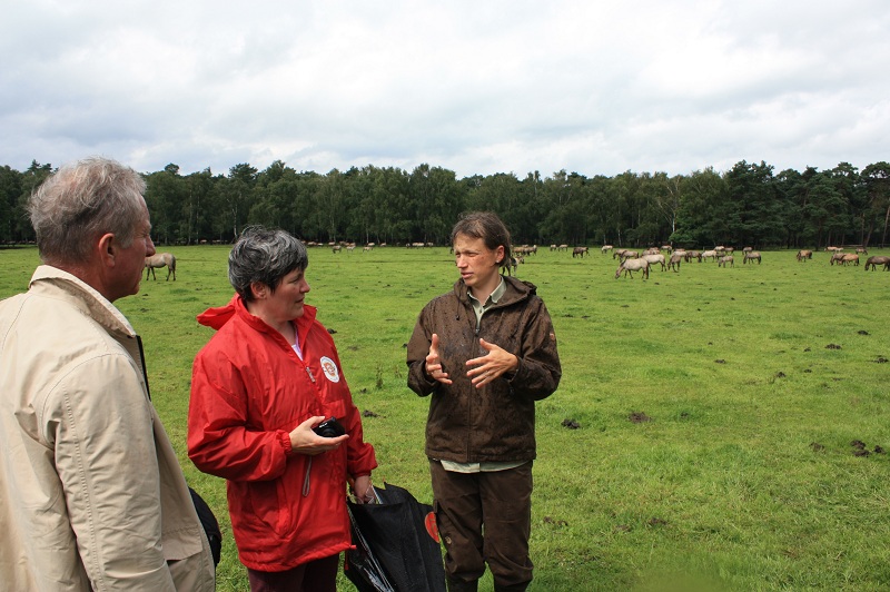 A 14 heures 15, Madame RÖVEKAMP, garde forestière de son état, nous accueille pour nous emmener à le rencontre du troupeau de chevaux sauvages du »Merfelder Bruch » non loin de Dülmen ! Nous essuierons deux averses magistrales pendant que stoïque elle nous cherche un passage à peu près sec dans les prairies et nous explique comment ce troupeau a échappé à la domestication et vit ici sans intervention humaine, si ce n’est une fois par an pour en capturer les jeunes mâles qui immanquablement ficheraient la pagaille… Les femelles vivent donc avec leurs jeunes ici et le mâle n’est invité que quelques semaines chaque année, ce qui limite aussi le nombre des naissances. Un troupeau de près de 400 bêtes sont donc à portée d’appareil photos mais inutile de s’approcher trop les animaux fuiraient et on n’a de toute façon pas le droit de les caresser. Quel dommage que le temps soit si humide et si froid, cela gâche la fête car c’est un spectacle extra-ordinaire au sens premier du terme !
