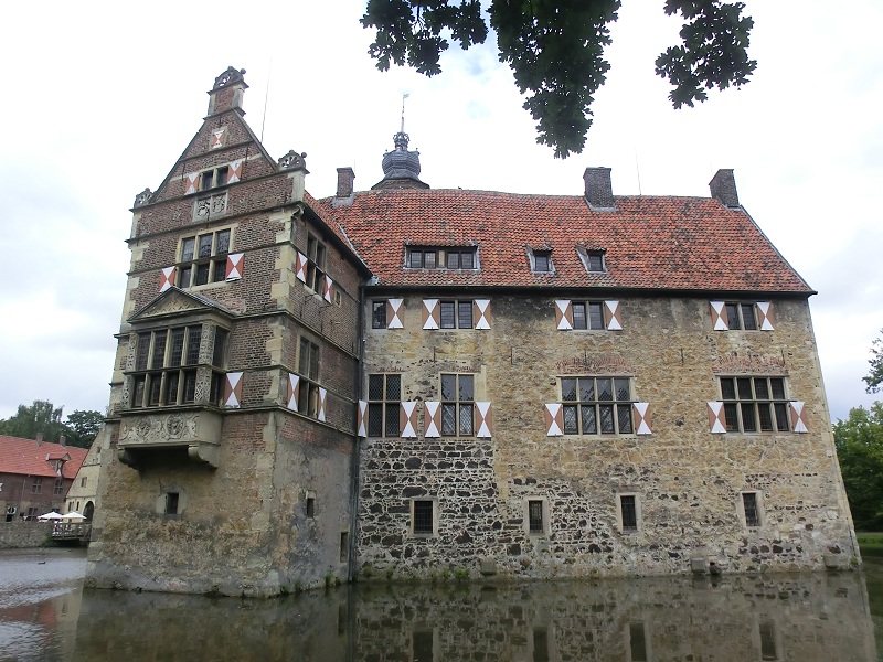 Ce matin nous partons à 9 heures : cette journée sera consacrée à la découverte d’une autre particularité de la Westphalie, ses châteaux entourés d’eau. Ingrid et Reinhard nous ont proposé d’en mettre 3 au programme de styles différents. Direction tout d’abord celui de Westerwinkel. La route tracée par nos amis est idéale, le temps est beau et la campagne magnifique ! Nous arrivons à Westerwinkel vers 10 heures 30 et faisons à pied le tour du château et rencontrons le paon blanc que je connais déjà.