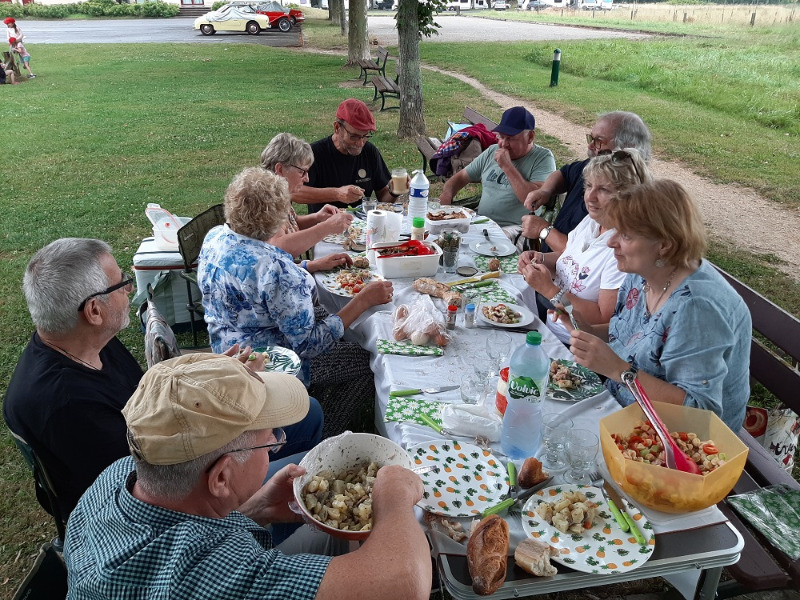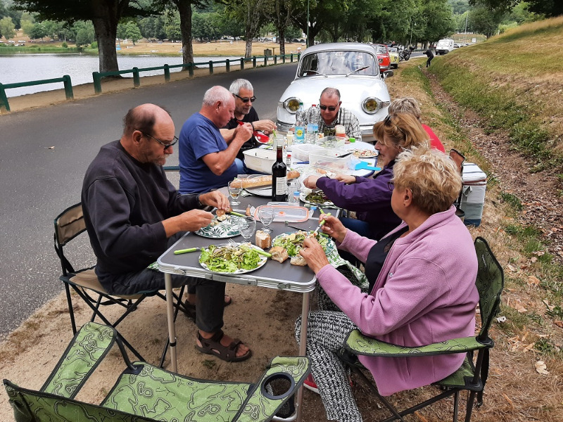 Puis nous prenons la route vers le lieu de notre pique-nique, au bord d'une petite rivière, au beau milieu d'un centre aéré... Un des gamins viendra discuter des voitures avec nous. La pluie est présente mais nous avons trouvé abri sous de grands arbres !