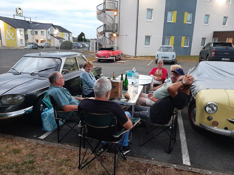 Accueil des plus sympathiques pour l'apéro dans un cadre magique pour des amateurs de véhicules anciens !